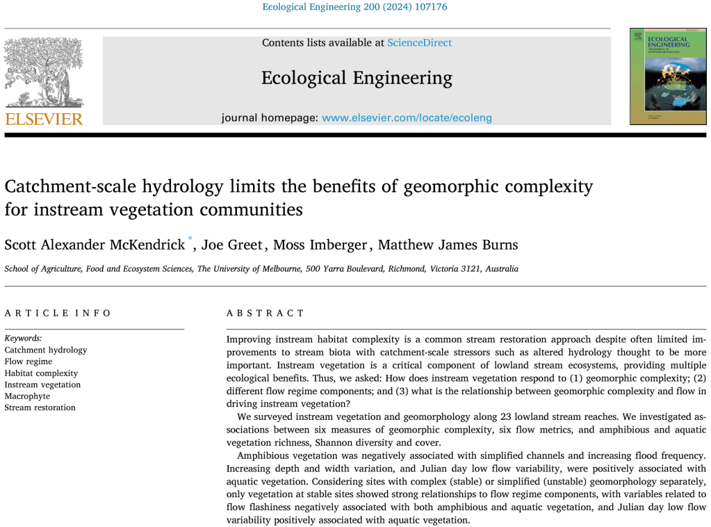 PhD student Scott McKendrick recently published this great article looking at the major drivers of instream vegetation communities across the Melbourne Water region. We showed that catchment-scale hydrology limits the benefits of geomorphic complexity for instream vegetation communities. This is just the first of several publications coming out of Scotts PhD…stay tuned for more!